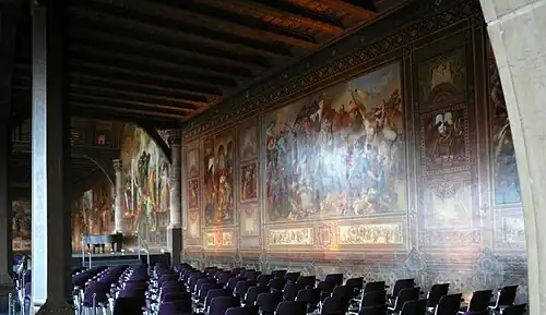Der Bilderzyklus umfasst in symmetrischer Anordnung um das monumentale Hauptbild zehn große Historiengemälde – je zwei an der Süd- und der Nordwand, je drei an Süd- und Nordhälfte der Westwand – sowie, im Wechsel mit den Großbildern der Westwand, acht kleinere Bilder. Unter jedem Großbild sind zwei kleine Grisaillen mit thematisch zugehörigen Szenen angeordnet. Die freien Flächen über und unter den kleineren Bildern sind mit weiteren Szenen im Fayencestil und mit Ornamentwerk ausgefüllt.