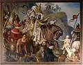 ![]() Barbarossas Fußfall vor Heinrich dem Löwen in Chiavenna (1176); darunter Grisaillen: Barbarossa beim Hoftag von Besançon (1157); Heinrich der Löwe unterwirft sich Barbarossa in Erfurt (1181) |