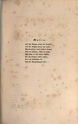 | 5 | Motto | ![]() Dem Buchtext vorangestellt ist auf Seite 5 folgendes Motto zu finden, das die romantische Sehnsucht nach heiler Welt widerspiegelt Motto. |
