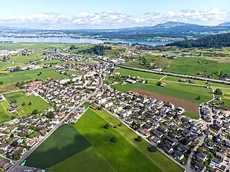 ![]() Drohnenaufnahme auf Höhe Bahnhof Siebnen-Wangen mit Blick Richtung Dorfzentrum.