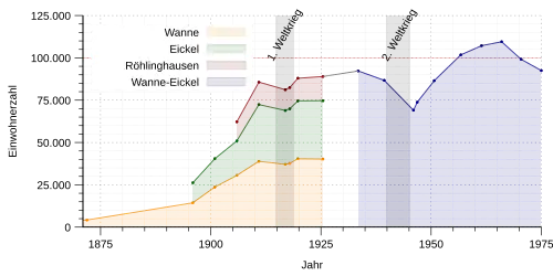Im Jahr 1926 schlossen sich die Gemeinden Wanne (40.000 Einwohner), Eickel (35.000 Einwohner) und Röhlinghausen (15.000 Einwohner) zur Stadt Wanne-Eickel mit rund 90.000 Einwohnern zusammen. 1955 überschritt die Einwohnerzahl der Stadt die Grenze von 100.000, wodurch sie zur Großstadt wurde. 1965 erreichte die Bevölkerungszahl von Wanne-Eickel mit rund 110.000 ihren historischen Höchststand (die Stadt zählte zu diesem Zeitpunkt mehr Einwohner als Herne). Seitdem nimmt die Einwohnerzahl wieder ab. Großstadt blieb Wanne-Eickel noch bis Anfang 1970. Bis 2001 sank die Zahl auf 80.218 Einwohner ab. Heute (Stand: 31. Dezember 2016) leben nur noch 67.694 Einwohner in den beiden Herner Stadtbezirken.[18]
