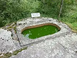 Um ein Verrutschen des Deckels zu verhindern, wurde um die Wanne herum eine rechteckige Vertiefung von 14 Zentimeter Breite ausgearbeitet. Gemäss örtlicher Überlieferung soll der Deckel in den Fluss gefallen und dort zersprungen sein. Durch eine schmale Rinne wurde das Regenwasser abgeleitet.