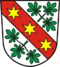 Blasonierung: „In Silber ein mit drei goldenen Sporenrädern belegter roter Schrägrechtsbalken, beseitet von zwei auswärts gekehrten dreiblättrigen grünen Kastanienzweigen.“[8] |