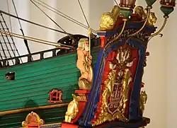 Das Heck-Schnitzwerk wie auch der gesamte Figurenschmuck des Schiffes wurden vom Bildhauer Christian Precht erstellt. Dieser sollte das Heck des Schiffes ähnlich dem Vorbild des 1666 ebenfalls von ihm fertiggestellten Portals am Bauhof in der Nähe des Deichtors fertigen. Am Heckspiegel wurde das Große Staatswappen von Hamburg, ein Abbild der Burg in Schildform, gehalten von zwei Löwen, als Blickfang und repräsentatives Schnitzwerk installiert. Gerahmt war dieses bildhauerische Werk von diversen allegorischen und in barockem Stil gehaltenen Schnitzereien. Auf den Heckspiegel aufgesetzt befanden sich am Heck drei große Laternen. Als Galionsfigur schmückte ein Löwe, wie auf vielen Segelkriegsschiffen niederländischer Bauart üblich, den Bug. Dieser hielt ein Schild mit dem Hamburgwappen in seinen Vorderpfoten.