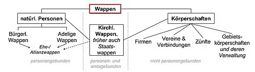 Wappen, die von natürlichen Personen geführt werden, können weiter nach dem Stand des Trägers in Adelswappen und bürgerliche Wappen unterschieden werden.