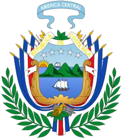 Am oberen Rand des Schildes steht auf einer Schriftrolle der offizielle Name der Nation. Darüber befindet sich ein blaues Band mit der Aufschrift America Central, spanisch für „Zentralamerika“.