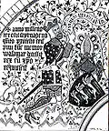 Siegel Waldemar IV. Atterdag (Regierungszeit 1340–1375). Frühe 1340er Jahre. Das Helmzeichen ist zwei Büffelhörner (dän.: vesselhorn) jedes Horn mit drei Gruppen Pfauenfedern besteckt.