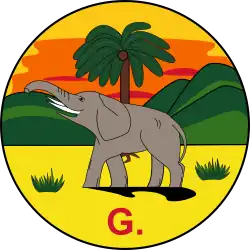 Es zeigt einen blauen Schild mit weißem und grünem Rahmen, in dem zwei sich kreuzende Werkzeuge dargestellt sind. Diese landwirtschaftlichen Geräte werden von den Mandinka verwendet. Es handelt sich hierbei um eine Axt, einer sogenannten dibongo, die bei der Erdnussernte gebraucht wird und um eine Hacke, genannt dabandingo, die zum Unkrautjäten verwendet wird.