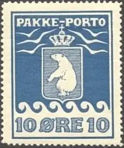 1820 übernahm König Friedrich VI. anlässlich der Trennung von Dänemark-Norwegen und den einhergehenden Verlusten im Wappen erneut den Eisbären für das dänische Wappen. Dabei wurde auch festgeschrieben, dass der Eisbär sitzt.[1] Dasselbe Motiv wurde 1905 auf den von Gerhard Heilmann entworfenen ersten grönländischen Freimarken genutzt.[2] In der Regierungszeit Christians X. (1912–1947) bürgerte sich ein, den Eisbären mit erhobener rechter Tatze darzustellen, wie es für heraldische Tiere üblich ist.