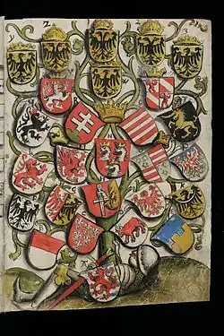 Das Wappen mit dem ersten roten golden gekrönten Luxemburger Löwen mit Doppelschweif ist im Wappenbuch des St. Galler Abtes Ulrich Rösch, dem Codex Haggenberg von 1470 gezeigt. Elisabeth von Luxemburg, die Tochter des letzten Kaisers aus dem Haus Luxemburg, Kaiser Sigismund, heiratete den Österreicher Albrecht II. von Habsburg, der ihrem Vater Sigismund als römisch-deutscher König und König von Böhmen nachfolgte. In dem Wappenbuch des Ulrich Rösch werden die beiden Stammbäume der Elisabeth von Luxemburg und des Albrecht von Österreich gezeigt.