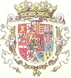 | Wappenschild | 1. Kastilien, 2. León, 3. Aragón, 4. Navarra, sowie Granada; Herz Bourbon-Anjou |