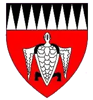 Der goldene Schild ist durch ein grünes Andreaskreuz schräggeviert; das Kreuz ist mit zwei gekreuzten, silbernen Speeren, schwarzen Pfeilen und einem braunen traditionellen Schild belegt.