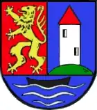 „oben eckig - unten abgerundet, Halbgespalten und geteilt; in den überhöhten oberen Feldern links in Rot ein goldener Löwe, rechts in Blau auf grünem Berg ein spitzbedachter silberner Rundturm, unten in Blau auf silbernen Wellen ein schwarzer Kahn.“