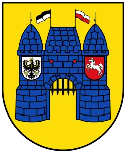 „Unter silbern-blau gespaltenem Schildhaupt, darin drei Lilien in verwechselten Farben, in Gold ein gezinntes blaues Burgtor mit offenem schwarzem Fallgatter, die Seitentürme mit Kuppeldächern, der Mittelbau mit einem Walmdach, das oben mit zwei abgewendeten Flaggen besteckt ist, die rechte schwarz-silbern, die linke silbern-rot geteilt. Die Seitentürme sind belegt mit je einem Schild: rechts in Silber ein goldengekrönter und -bewehrter schwarzer Adler mit goldenen Kleeblattstängeln auf den Flügeln und auf der Brust belegt mit dem goldenen Monogramm FR, überhöht von einer goldenen Königskrone; links in Rot ein silbernes springendes Ross. Auf dem Schild ruht eine rote dreitürmige Mauerkrone, deren mittlerer Turm mit dem Berliner Wappenschild belegt ist.“[1]
