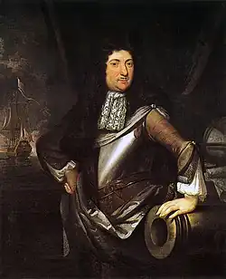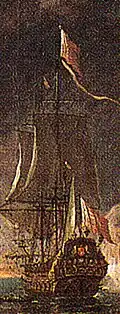 - ↑ In Quellen und Sekundärliteratur werden einige der Konvoischiffe manchmal als Fregatten bezeichnet, auch wenn es sich bei den Schiffen um relativ große Zweidecker (das bedeutet zwei Geschützdecks) handelte. Sie waren aber keine Fregatten im neueren Sinne des ab Mitte des 18. Jahrhunderts eingeführten Typs leichterer, sehr seetüchtiger Kriegsschiffe mit nur einem Geschützdeck. Im 17. und in der ersten Hälfte des 18. Jahrhunderts wurde der Begriff "Fregatte" für eine ganze Anzahl verschiedener Schiffstypen benutzt, so dass viele Schiffe von sehr kleinen "Eindeckern" bis hin zu relativ großen "Zweideckern" so bezeichnet werden konnten.