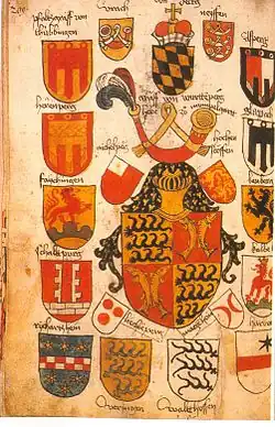 - Grünenberg-Wappenbuch, Wappenbuch des Conrad Grünenberg, 1483 fertiggestellt, rund 2000 Wappen. Es gilt als eines der wichtigsten Wappenbücher des Mittelalters. Mindestens neun Handschriften sind erhalten.[2]