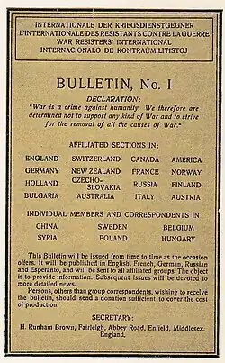 Die War Resisters’ International (WRI) (Internationale der KriegsdienstgegnerInnen) ist ein 1921 in den Niederlanden ursprünglich unter dem Namen „Paco“ (dem Esperanto-Wort für Frieden) gegründetes weltweit agierendes Netzwerk von Antimilitaristen, Kriegsdienstverweigerern und Pazifisten, dem nach eigenen Angaben gegenwärtig etwa 90 Organisationen, Vereine und Verbände in mehr als 40 Ländern angehören.[1] Der heutige Sitz der WRI-Zentrale befindet sich in der britischen Hauptstadt London.