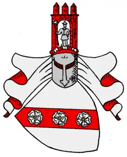 Das Wappen zeigt im silbernen Feld einen mit drei silbernen Rosen belegten schrägrechten roten Balken. Auf dem Helm mit rot-silbernen Decken eine dreitürmige rote Burg, in deren Tor ein Geharnischter steht.