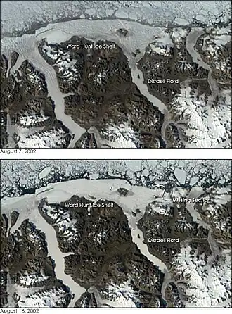 - ↑ Zerfall des Ward-Hunt-Schelfeises 2008 (englisch)