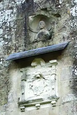 Das Niveau des Grundes, auf dem die Burg steht, wurde um das 18. Jahrhundert entscheidend verändert. Im Mittelalter fiel er von der Burg weg steil ab, sodass diese auf einer Art niedrigem Hügel stand. Der Zugang zum Haupteingang war vermutlich durch einen breiten Graben geschützt, den eine Zugbrücke überspannte. Außerdem war der Eingang wohl durch ein Fallgatter zu sichern, auch wenn es davon heute keine Spuren mehr gibt.[7] Zwischen den Türmen auf der Höhe der Zinnen kann man Überreste einer hervortretenden Galerie oder Barbakane erkennen, die zur Verteidigung des Haupteingangs diente. Über dem Portal des Haupteingangs sind das Wappen der Arundells und eine Beschreibung des Besitzes von Wardour angebracht. Diese hatte Sir Matthew Arundell 1578 zur Feier der Rückgabe des Familienbesitzes, der bei der Hinrichtung von Sir Thomas Arundell 1552 eingezogen worden war, anbringen lassen. Über dem Wappen befindet sich der Kopf Christi in einer Nische, versehen mit der Inschrift „Sub nomine tuo stet genus et domus“.[8]