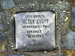 Die 1927/1928 im neobarocken Stil erbaute Freiburger Villa der Familie Arthur Knopf (Beethovenstraße 8 ▼), die von der Familie aber schon 1935 aus finanziellen Gründen verkauft worden war, wurde nach Kriegsende von den französischen Besatzungstruppen beschlagnahmt, später kam sie in verschiedene private Hände. Sie steht unter Denkmalschutz und ist seit 1989 im Besitz der Hamburger Johann Carl Müller-Stiftung, die dort einen integrativen Montessori-Kindergarten betreibt. Ein Stolperstein am Eingang zum Garten der Villa erinnert heute an die Geschichte der Familie Knopf.[10] Der Stolperstein verweist auf Betty Knopf, die jedoch Mitte der 1920er-Jahre mit ihren Eltern, zuletzt mit der Mutter Rebekka Knopf im Haus Ludwigstraße 30 in Freiburg ▼ wohnte, das beim Luftangriff im November 1944 vollständig zerstört wurde.[6]