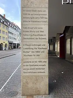 - ↑ Bernd Serger: Ausstellung zeichnet die Geschichte des jüdischen Kaufhauses Knopf nach. In: Badische Zeitung. 4. Juni 2014, archiviert vom (nicht mehr online verfügbar) am 14. Juni 2014; abgerufen am 8. Juni 2019.