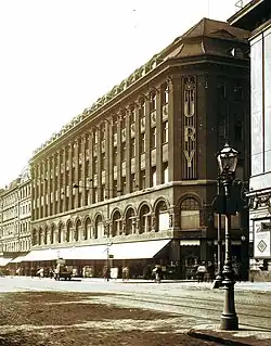 Das fünfgeschossige Gebäude war im Reformstil errichtet. Über der Schaufensterzone im Erdgeschoss erhob sich die erste Etage mit breiten Rundbogenfenstern und Bauschmuck dazwischen. Die übrigen Etagen hatten schmalere Fenster mit neunzehn Achsen zum Platz und neun zur Nonnenmühlgasse. Die Fensterzwischenräume traten als flache kannelierte Lisenen leicht hervor und trugen alle am oberen Ende eine Bogenlampe. Über dem doppelten Traufgesims erhob sich ein gestuftes Walmdach mit einer Reihe Bogendachgauben und einer Reihe Fledermausgauben darüber.