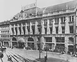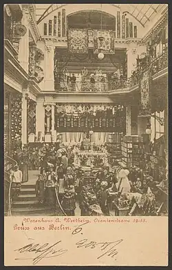 1890 wurde ein weiteres Geschäft in der Oranienstraße 145/146 gegründet, das ein umfangreicheres Warensortiment anbot. Durch die zusätzlich gegebene Trennung der Sortimente in verschiedene Abteilungen wurde der Weg zum modernen Warenhaus geebnet.[3][4] Eine weitere Filiale eröffnete im Oktober 1892 in der Leipziger Straße 111 in einem angemieteten Geschäftshaus.[5] Für diese Filiale wurde möglicherweise erstmals der Begriff „Warenhaus“ verwendet. Dieser Begriff wurde von Wertheim auch deshalb eingeführt, um den für die ersten beiden Wertheim-Filialen und Konkurrenzgeschäfte wie Lubasch besonders vom traditionellen Einzelhandel geprägten Begriff „Ramschbazar“ abzulösen. Der Begriff besaß eine völkisch-rassistische Konnotation, wie auch insgesamt die Kritik an den Warenhäusern im Deutschen Reich oft mit antisemitischen Argumenten geführt wurde.[6] Neben der Neuausrichtung durch die Bezeichnung „Warenhaus“ fand mit der Eröffnung der neuen Filiale auch durch die Lage an der Leipziger Straße eine Abgrenzung von den vorherigen Geschäften statt, die in einfacheren Bezirken lagen. Die Leipziger Straße hatte sich ab der Reichsgründung 1871 zu einer gehobenen Haupteinkaufsstraße entwickelt.[6] Trotz der Änderungen die Wertheims noch zur Konzeption des Neubaus einbringen konnte, erwies sich das ursprünglich als Wohngebäude geplante Gebäude als unzureichend für die Zwecke eines Warenhauses. Neben schlechter Belüftung und Belichtung, erwies es sich auch schnell als zu klein. So kam es auch mehrfach zu Unstimmigkeiten mit der Baupolizei und die geplante Hebung des Standards gelang nur teilweise.[7]