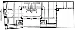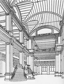 Im Inneren waren auf vier Geschossen über einer Grundfläche von 1302 Quadratmetern Einkaufsflächen vorhanden, während im Dachgeschoss zwei niedrige Geschosse für Personal und Geschäftsleitung eingerichtet waren.[1] Mittig im Gebäude war ein 16 Meter hoher Lichthof mit einer Grundfläche von 10 × 19 Meter platziert. Der Hof belichtete von oben alle Etagen und war mit einer repräsentativen Treppe ausgestattet. Die Geschosse wurden durch Pfeiler getragen, auf denen auf allen vier Seiten ionische Pilaster angebracht waren. Das gläserne Dach in Form eines Stichkappengewölbes setzte über einem Konsolgeison über dem ersten Obergeschoss an.