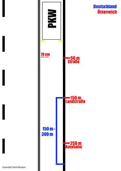 Es gibt keinen vorgeschriebenen Aufstellabstand des Pannendreiecks zum Fahrzeug.[9] Laut ÖAMTC genügt es, wenn ab Erkennen des Dreiecks genügend Zeit und Abstand zum Ausweichen oder Anhalten verbleibt.[10]