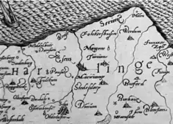Warnsath als „Warnsate“ auf der Ubbo-Emmius-Karte von 1595 (unterer Bildrand, rechte Hälfte)