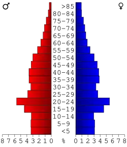 Auf das gesamte County bezogen setzte sich die Bevölkerung zusammen aus 23,1 Prozent Einwohnern unter 18 Jahren, 16,2 Prozent zwischen 18 und 24 Jahren, 29,1 Prozent zwischen 25 und 44 Jahren, 21,1 Prozent zwischen 45 und 64 Jahren und 10,5 Prozent waren 65 Jahre alt oder darüber. Das Durchschnittsalter betrug 32 Jahre. Auf 100 weibliche Personen kamen 96,2 männliche Personen. Auf 100 Frauen im Alter von 18 Jahren alt oder darüber kamen statistisch 93,0 Männer.