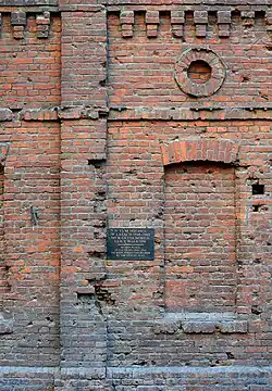 Die Mauer entlang der Waliców-Straße besteht aus Ziegeln und ist ebenfalls mit Gesimsen und Lisenen reich gegliedert und verfügt stellenweise über sekundär durchbrochene rechteckige Fensteröffnungen, Oculi über den Nischen sowie Einschusslöchern an der Wand, deren Erhalt von der Denkmalschutzbehörde vorgeschrieben ist. An dieser Mauer – eine der wenigen noch erhaltenen Fragmente der Ghettobegrenzung[3] – erinnert eine Gedenktafel an den Verlauf der Ghettogrenze. Die zunächst aus Zinn bestehende Tafel wurde im Mai 2000 durch eine aus Bronze ersetzt.