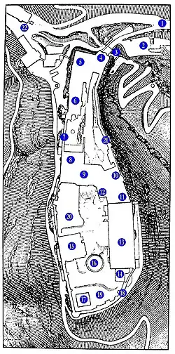 Die Burg wurde in ihrer Geschichte mehrmals belagert, aber nie erobert, und war in ihrer Blütezeit folgendermaßen aufgeteilt: