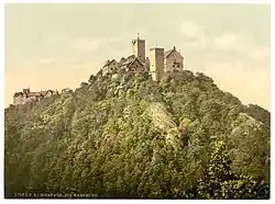 Die Wartburg erhebt sich auf einem schmalen, schroffen Felsgrat etwa 220 m über der Stadt Eisenach. Von ihr aus kann man unter anderem den 17 km nahen Großen Inselsberg im Südosten, die 58 km entfernte Wasserkuppe im Südsüdwesten, und den 95 km entfernten Brocken im Norden erblicken.[32] Sie ist eine typische Abschnittsburg, die ursprünglich aus vier Abschnitten bestand, von denen heute nur noch die Vor- und die Hauptburg erhalten sind. Die größten und für den Baukörper nicht immer vorteilhaften Veränderungen erfuhr die Wartburg im 19. Jahrhundert, als die Restaurierung der Burg auf Goethes Initiative hin im damaligen Gedankengut des Historismus und des wieder erstarkten Nationalismus des deutschen Kaiserreiches erfolgte.