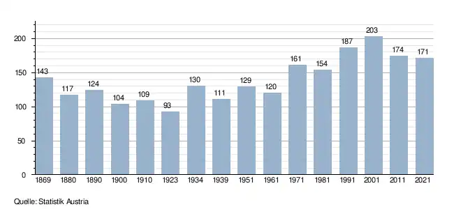 - ↑ Statistik Austria – Bevölkerung zu Jahresbeginn nach administrativen Gebietseinheiten (Bundesländer, NUTS-Regionen, Bezirke, Gemeinden) seit 2002 (ODS)