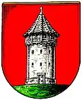 Blasonierung: „Im roten Schild ein silberner mittelalterlicher Wachturm auf grünem Hügel.“[6] |