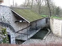 Das Waschhaus aus Bruchsteinmauerwerk mit Pultdach wird von einem Bach und einem Brunnen mit Wasser versorgt.