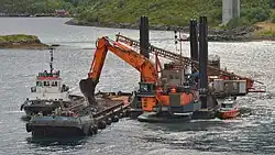 - Plattform mit teleskopierbaren Stützen, die bis auf den Gewässergrund abgesenkt werden können. Dadurch entsteht eine stabile, von Wasserbewegungen unabhängige Arbeitsfläche. Für Positionsveränderungen werden die Stützen eingefahren, und die Hubinsel kann per Schlepper an einen neuen Einsatzort gebracht werden.