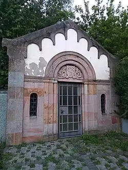 Der neuromanische Sandsteinquaderbau ist mit der Jahreszahl 1907 bezeichnet. Er wurde nach Plänen des Architekten und Stadtbaumeisters Jakob Schmitt errichtet. Der Satteldachbau erhält durch den unterschiedlich farbigen Sandstein sein besonderes Gepräge.