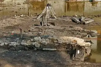 ![]() Holzbalken der Wasserburg in der Baugrube | ||