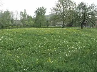Auf dem Gelände finden sich einige Obstbäume, hauptsächlich in einer lückenhaften Kette, die etwa seine Kontur markiert. Ansonsten wird es heute als Wiese bemäht.