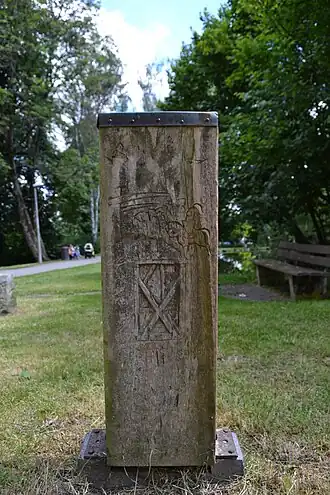 Eine Holzstele aus einem Vierkantholz mit vier geschnitzten Inschriftseiten ist beim Oberen See in der Nähe einer Drillingsbirke aufgestellt. Sie erinnert an die Reste der Zugbrücke, die hier aufgestellt waren.