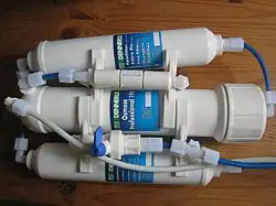 Das bei der Umkehrosmose gewonnene Wasser entspricht dem umgangssprachlichen „Osmosewasser“. Bei diesem Prozess wird das zu reinigende Wasser unter Druck durch eine semipermeable Membran getrieben und hinterlässt dabei neben allen suspendierten Partikeln einen Großteil aller ionisierten oder hinreichend großmolekularen Stoffe, inklusive der Mineralien und Spurenelemente.[3] Gängige Systeme zur Wasseraufbereitung mittels Umkehrosmose weisen meist einen großen Anteil ungenutzten Abwassers auf. Der pH-Wert wird durch den Basenentzug in der Regel auf 6 bis 6,5 abgesenkt, denn das gelöste Kohlendioxid verbleibt im Filtrat und wirkt einseitig als Säure. Außerdem wird ein minimaler Wasserdruck von 3,5 bar für den pumpenlosen passiven Betrieb vorausgesetzt. Durch Sidestream-Filtration kann das Wasser-Abwasser-Verhältnis deutlich verbessert werden.[4] Zum Entsalzen von Meerwasser ist die Umkehrosmose kostengünstiger als die aufwändigere energieintensivere Destillation. Hierbei kommen Membranen aus Polyamiden und Polysulfonen zum Einsatz, die in Form von Hohlfasern eine hohe Drucktoleranz bei gleichzeitiger großer spezifischer Oberfläche aufweisen. Das so aufbereitete Meerwasser hat allerdings einen so niedrigen Salzgehalt, dass es insbesondere als Trinkwasser ungeeignet ist.[5] In der Industrie wird Umkehrosmose eingesetzt, um z. B. chemisch (fast) reines H2O, Saftkonzentrate oder alkoholfreies Bier herzustellen oder auch Tafelwasser vorzubehandeln.