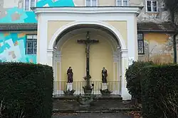 Die Statuen der heiligen Johannes Nepomuk und Karl Borromäus wurden später von ihrem ursprünglichen Aufstellungsort entfernt und vor der Pfarrkirche Sankt Stephan aufgestellt.[1]
