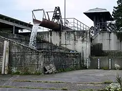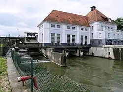 - Betriebsgebäude mit Schaltwarte und Werkswohnung, dreigeschossiger Walmdachbau mit zweigeschossigem Flachdach-Vorbau,