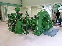 Im Maschinenhaus sind drei Maschinensätze verbaut, von denen zwei bis heute über Francis-Turbinen betrieben werden, die Voith 1911 in Heidenheim herstellte. Diese Turbinen haben eine Leistung von 490 kW bei einer Drehzahl von 600 Umdrehungen pro Minute. Das Laufrad hat einen Durchmesser von 540 Millimetern, die Schaufeln sind 120 Millimeter breit.[2] Angeschlossen war bis 2012 je ein 1911 bei der Chemnitzer Elektricitäts-AG Pöge gebauter Zweiphasen-Synchrongenerator. Der Zweiphasenstrom wurde über einen Scott-Transformator in einem Nebengebäude in den üblichen Dreiphasen-Drehstrom umgewandelt.[3] Bei der Modernisierung des Wasserkraftwerkes 2012 wurden die alten Generatoren durch Dreiphasen-Generatoren aus dem Anhaltischen Elektromotorenwerk Dessau mit 500 kVA Leistung ersetzt. Außerdem wurde der dritte Maschinensatz mit Durchströmturbine und einem 150 kVA-Generator installiert.