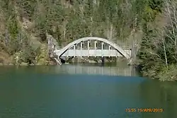Am Speichersee Wangen kann das Wasser aus dem Zuleitungs-Stollen über eine Bogenbrücke über den Stausee und damit an diesem vorbei geleitet werden.