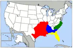 Die Art bewohnt die wasserreichen Niederungen im Südosten der USA. Das Verbreitungsgebiet entspricht weitgehend dem Naturraum der Atlantischen Küstenebene (Atlantic Coastal Plain). Die Arealgrenze der Art verläuft im Westen durch Zentral-Texas und den Osten von Oklahoma, im Norden durch die Bundesstaaten Missouri, Illinois und dann, unter südlicher Umgehung der Appalachen, durch Georgia, North und South Carolina und Virginia bis zur Atlantik-Küste. Im Süden endet das Areal an der Grenze zu Mexiko, weiter östlich am Golf von Mexiko bzw. am Atlantik. Die Art schwimmt regelmäßig im Salzwasser und hat daher auch eine ganze Reihe von Inseln vor der Küste im Südosten der USA besiedelt.