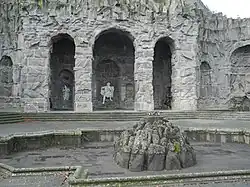 Am Hang unmittelbar östlich unterhalb des Oktogons befindet sich die sogenannte Vexierwassergrotte, mit drei Wandnischen. In der mittleren und größten stand ursprünglich eine Skulptur des Kyklopen Polyphem, seit dem 19. Jahrhundert dann die des mythologischen Hirtengotts Pan. Versteckt hinter der Figur des Zyklopen und später des Hirtengotts stand ab 1705 die erste Wasserorgel, gebaut von Andreas Zahn und Johann Wenderoth.[1] 1778 erneuerte der damalige Hoforgelbauer Georg Peter Wilhelm das Spielwerk komplett.